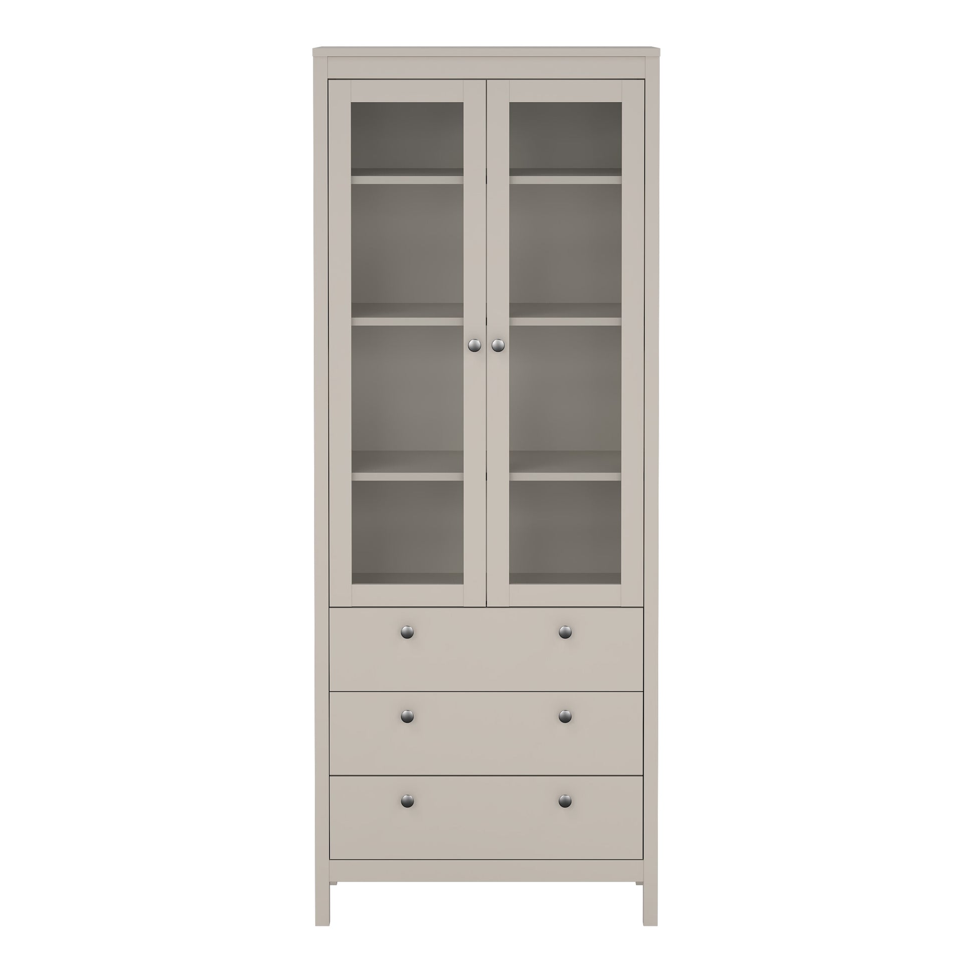 Add a touch of refined elegance to your home with the Harrow China Cabinet in Cashmere. This tall, modern cabinet combines stylish display with practical storage, crafted from durable, scratch-resistant laminated board in a soft cashmere tone. Two framed glass doors showcase your favourite décor or dinnerware, while three smooth-glide drawers offer generous concealed storage. The mix of open display and closed compartments makes it a perfect fit for both dining and living rooms.