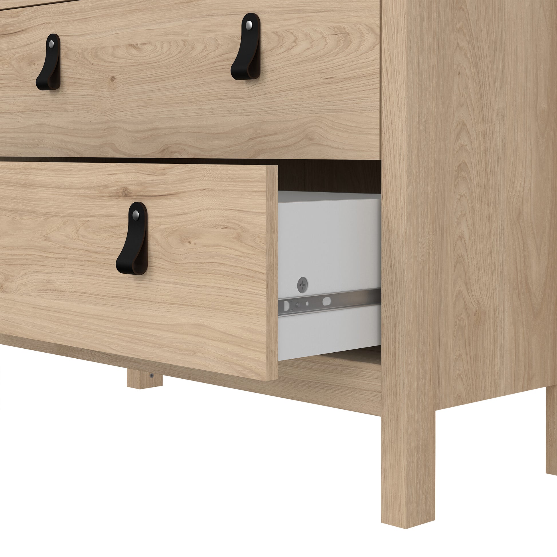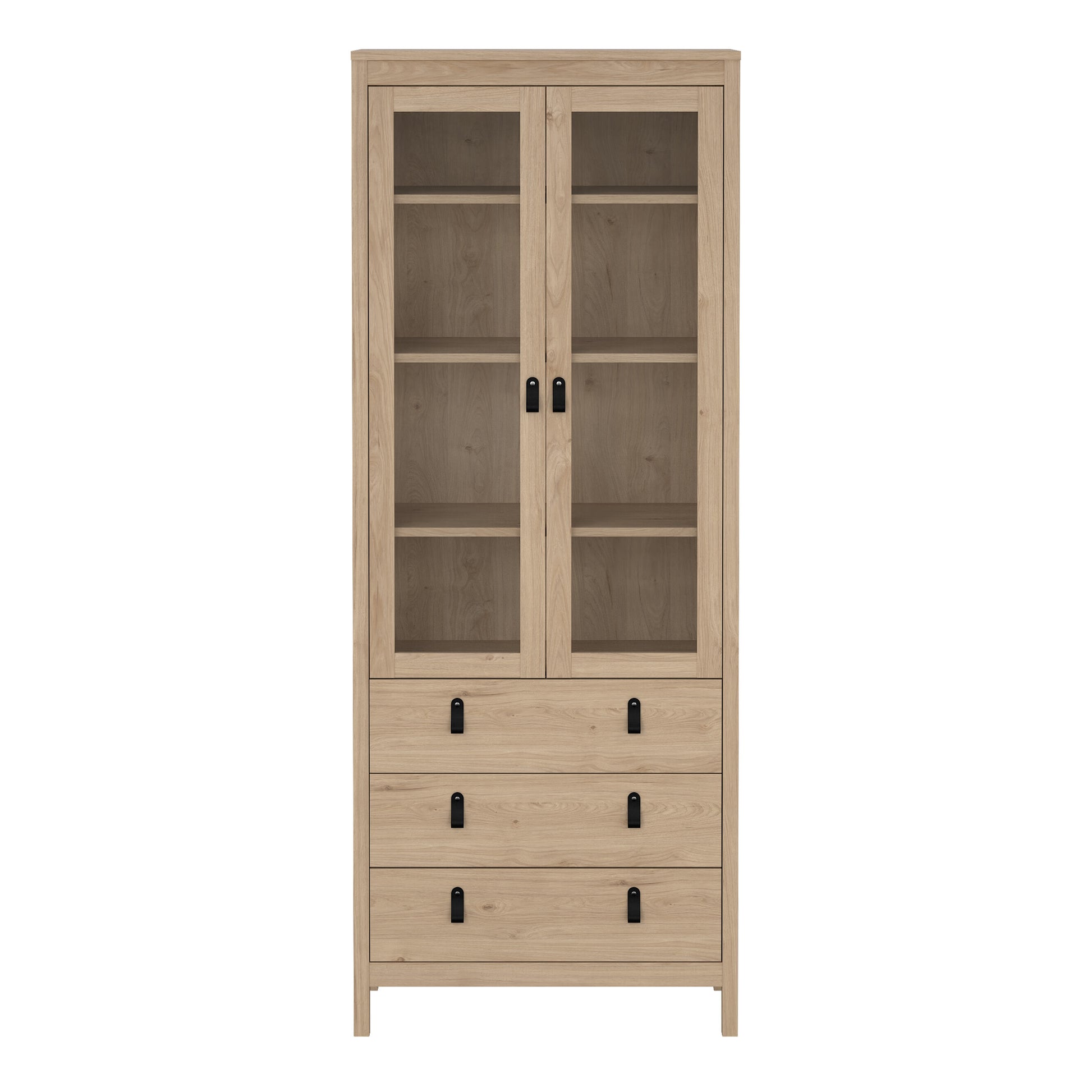 The Harrow China Cabinet blends form and function with two tall glass doors for display and three drawers for concealed storage. Finished in Jackson Hickory Oak with leather strap handles, this unit makes a striking and useful addition to any modern dining room.