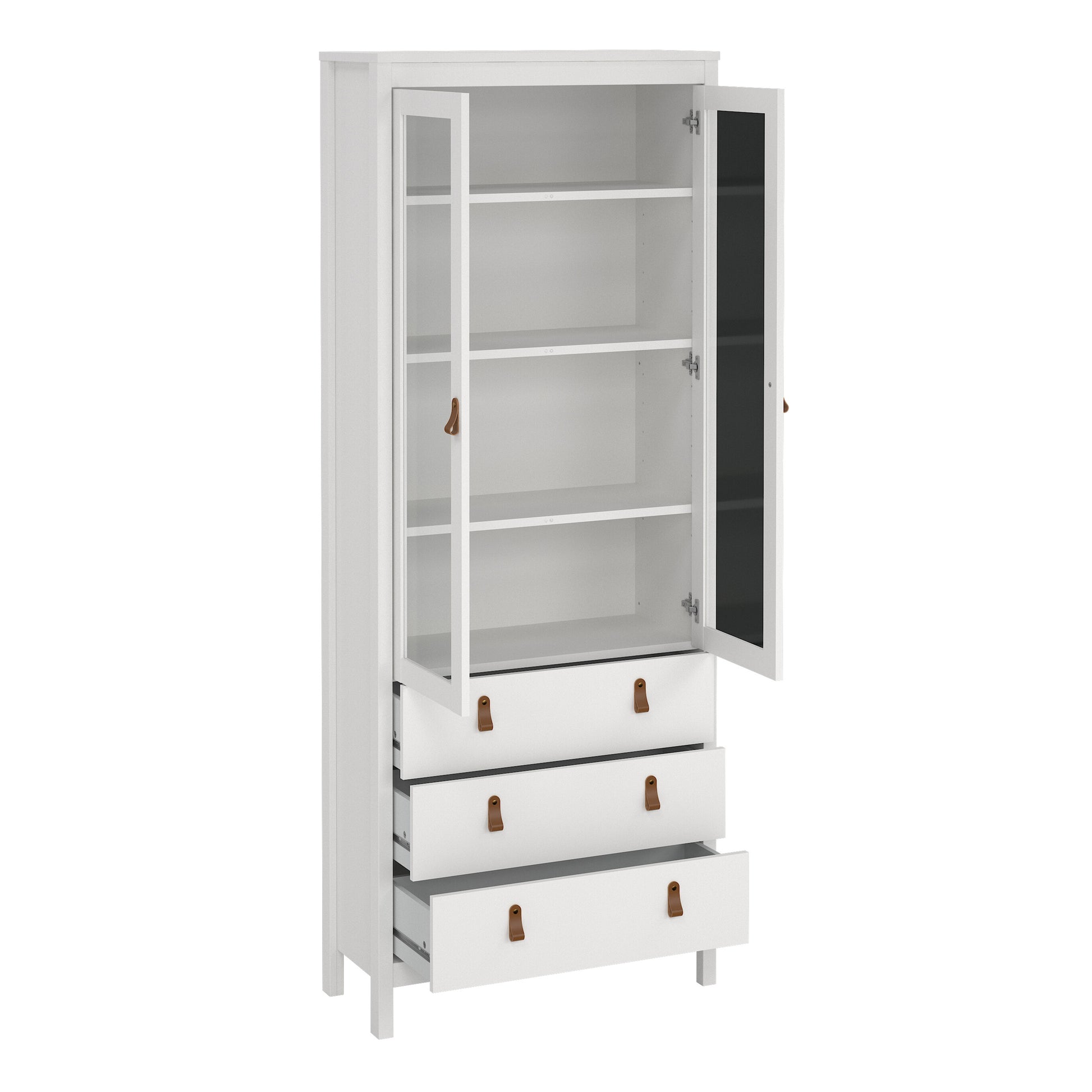 Elevate your space with the Harrow China Cabinet in White — a stunning display & storage solution that blends style and function. Crafted with high-quality laminated board and PEFC-certified sustainable wood, this cabinet features two glass doors to display your finest dinnerware, glassware or collectibles, three drawers with smooth gliding runners for concealed storage, and adjustable hinges for precision alignment. Its tall yet slim profile (W 78 × H 199 × D 32.5 cm), leather tab handles, and easy-self-assembly design make this piece perfect for modern, Scandinavian or minimalist homes. Clean, elegant and durable — all in one.