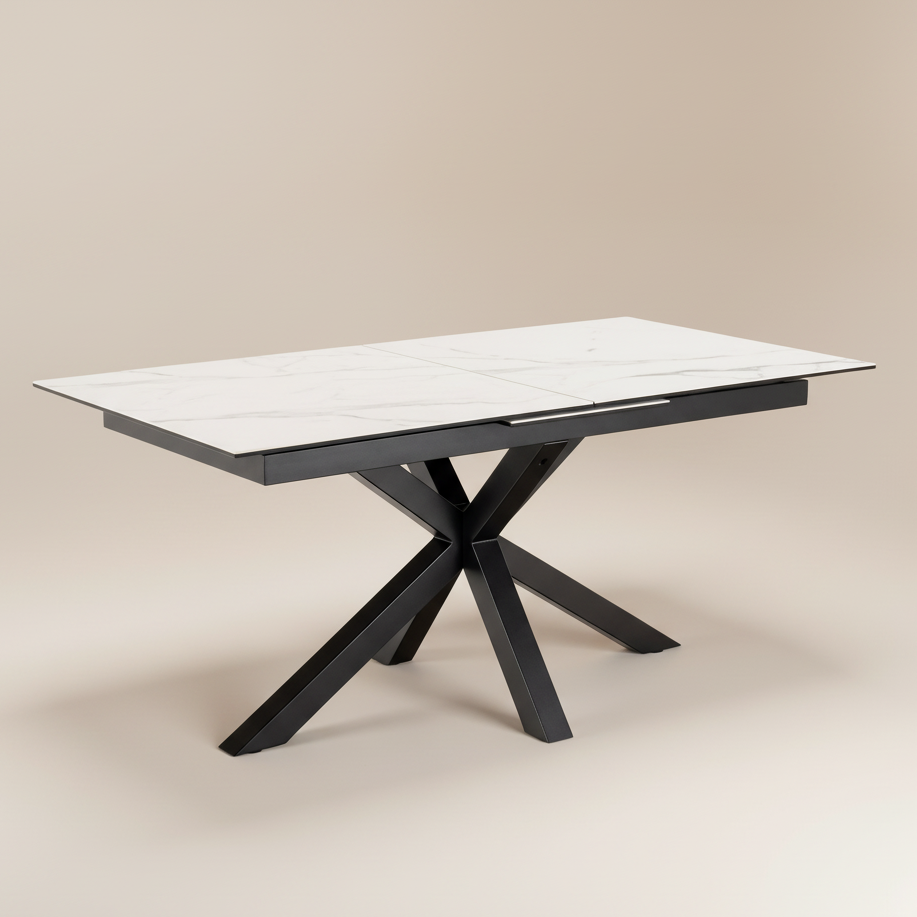 This Meridian Extendable Table in Ceramic White combines beauty and practicality. Its marble-look surface is scratch and heat-resistant, while the hidden extension leaf and sleek black cross base make it an elegant solution for dining spaces that require both form and function.
