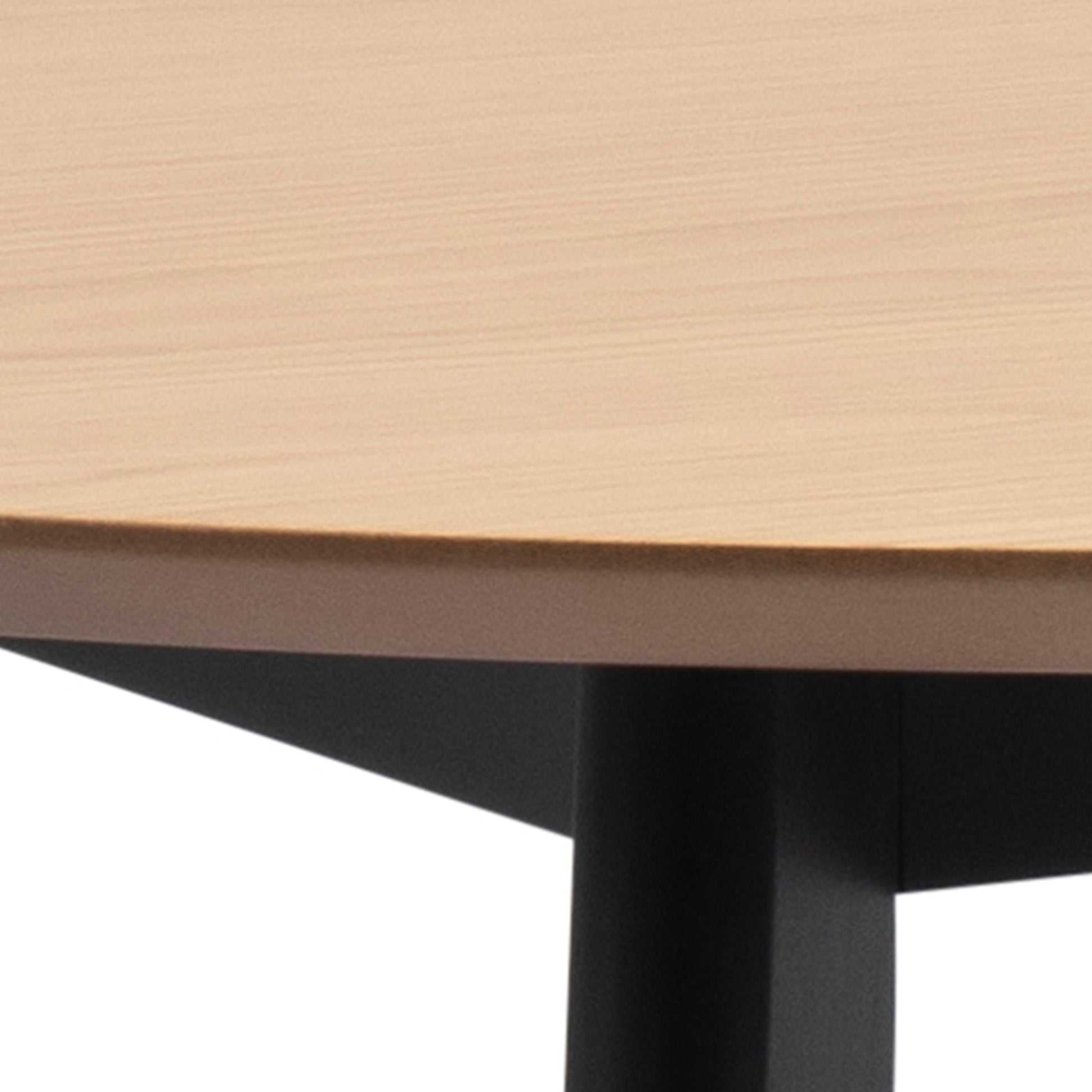 Delight in the classic elegance of our round dining table, featuring a rich oak veneer top and a striking matte black base. Its circular form is designed to create an inviting atmosphere for dining and socializing in any modern home.