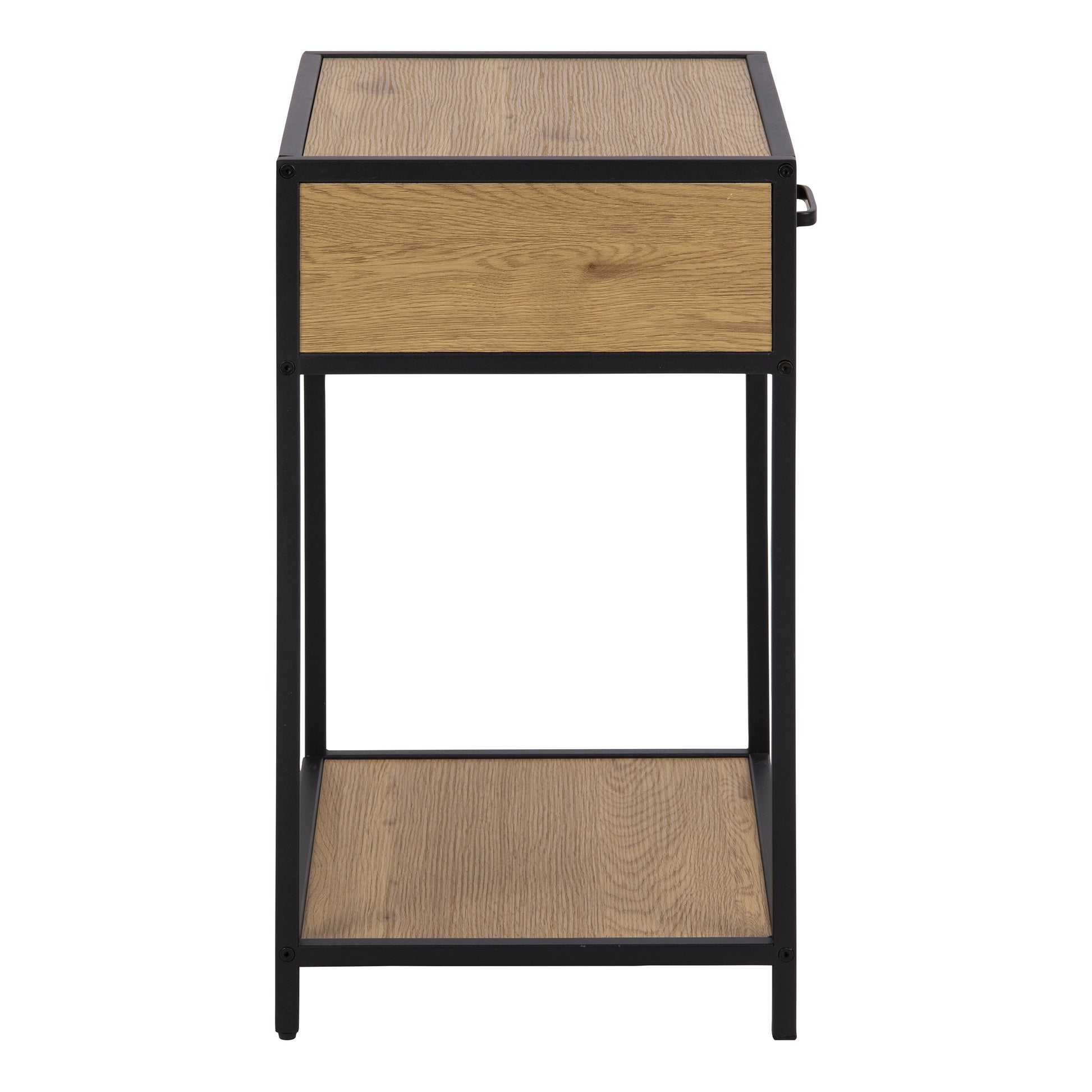 This rectangular bedside table features a matte wild oak finish on its top, drawer, and shelf, paired with a robust matte black powder-coated steel frame. Equipped with smooth metal runners, it offers easy drawer operation. Combining rustic appeal with industrial strength, this table is a perfect fit for contemporary bedrooms seeking both style and durability.