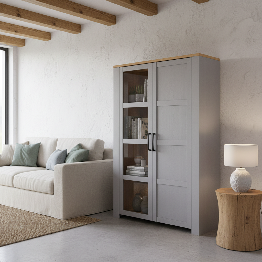 Add warmth and function with the Whisper Display Cabinet in Grey and Oak. Complete with black handles, soft-close doors, and dual LED lights, it’s designed to highlight your favourite pieces with stylish flair.